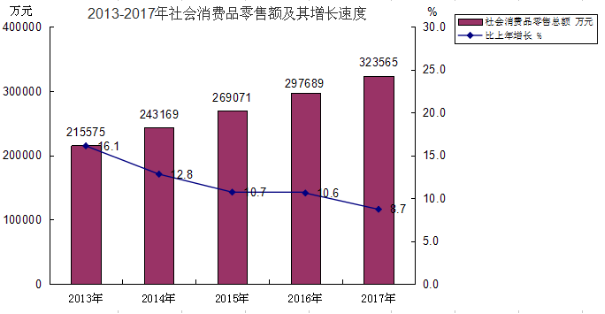 消费市场。全年实现社会消费品零售总额323565万元,比上年增长8.7%。按地域分:城镇零售额271313万元,增长8.8%;农村零售额52252万元,增长8.2%。分行业看,批发业零售额8997万元,增长8.7%;零售业零售额235864万元,增长8.6%;住宿业零售额8463万元,增长8.8%。餐饮业零售额70241万元,增长8.9%