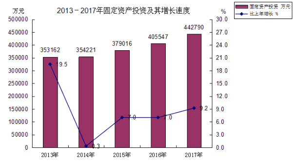 固定资产投资。全年完成固定资产投资442790万元,比上年增长9.2%,第一产业完成投资71696万元,增长0.3%;第二产业投资107490万元,增长7.1%;第三产业投资263604元,增长12.8%。