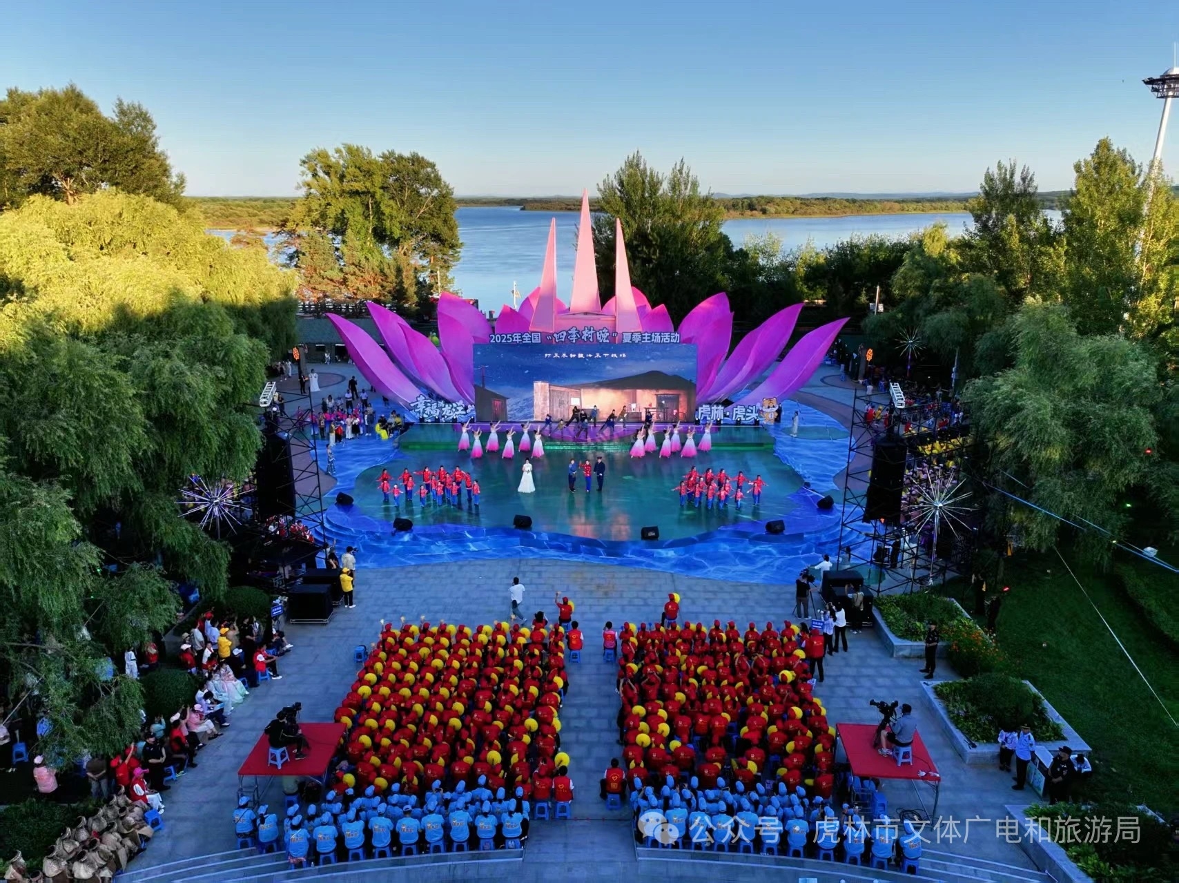 活动主会场“夏夜荷花”舞台是本届“村晚”亮点之一,灵感源自虎林“中国野生荷花之乡”的美誉,将虎林市花的生态意象与艺术表现完美结合,在乌苏里江的柔波映衬下,构成“人在荷中坐,舞从水上来”的沉浸式体验。