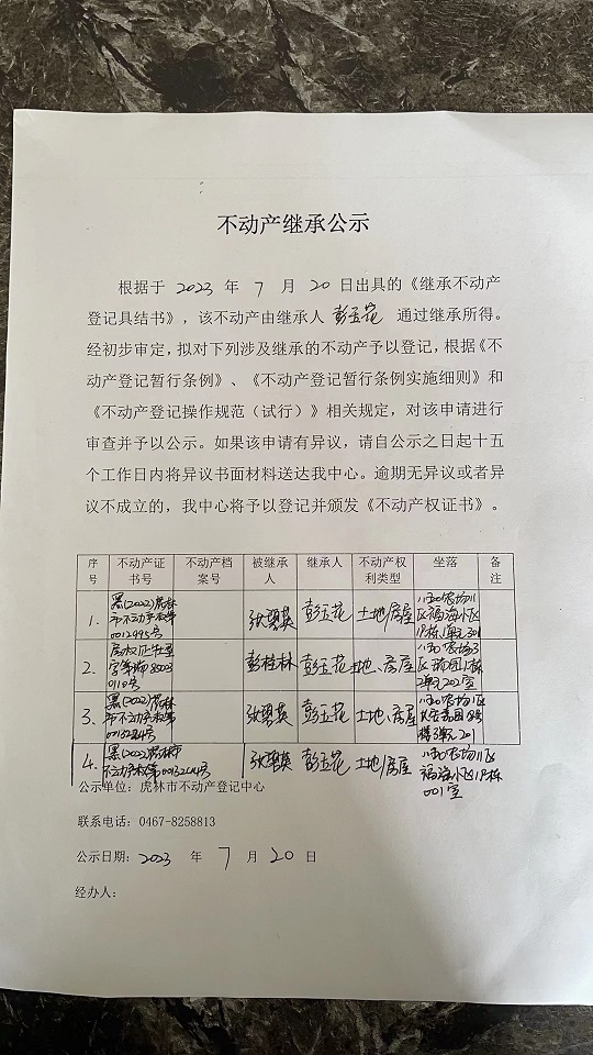 不动产继承公示-彭玉花
