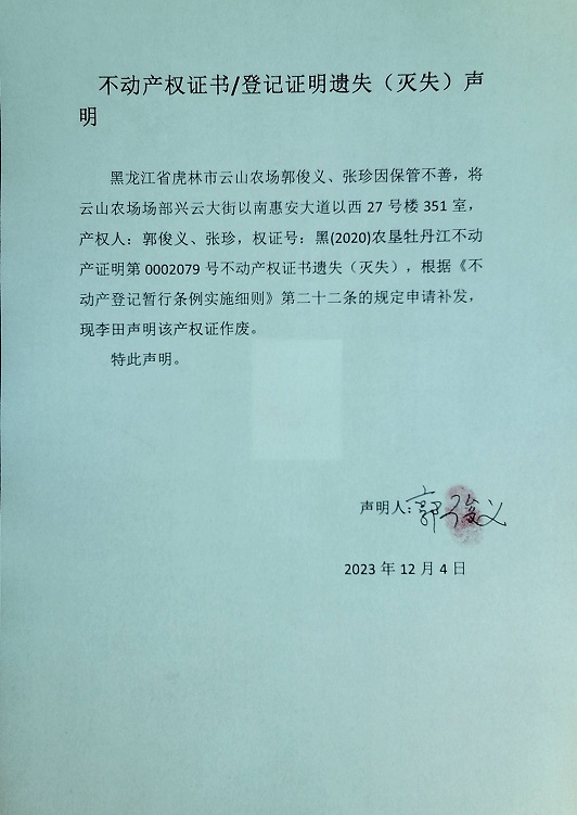 不动产权证书遗失声明-郭俊义