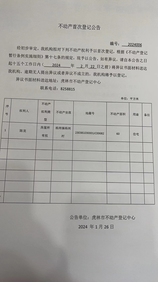 不动产首次登记公告-陈龙