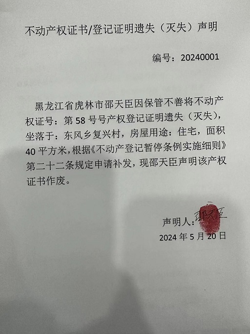 不动产权证书遗失声明-邵天臣