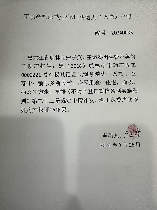 不动产权证书遗失声明-宋长武、王淑香