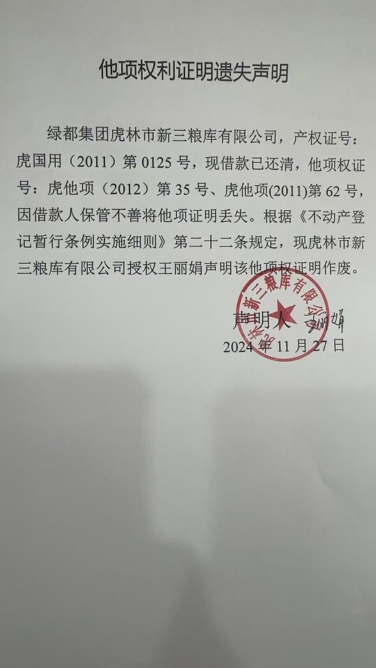 他项权利证明遗失声明-绿都集团虎林市新三粮库有限公司