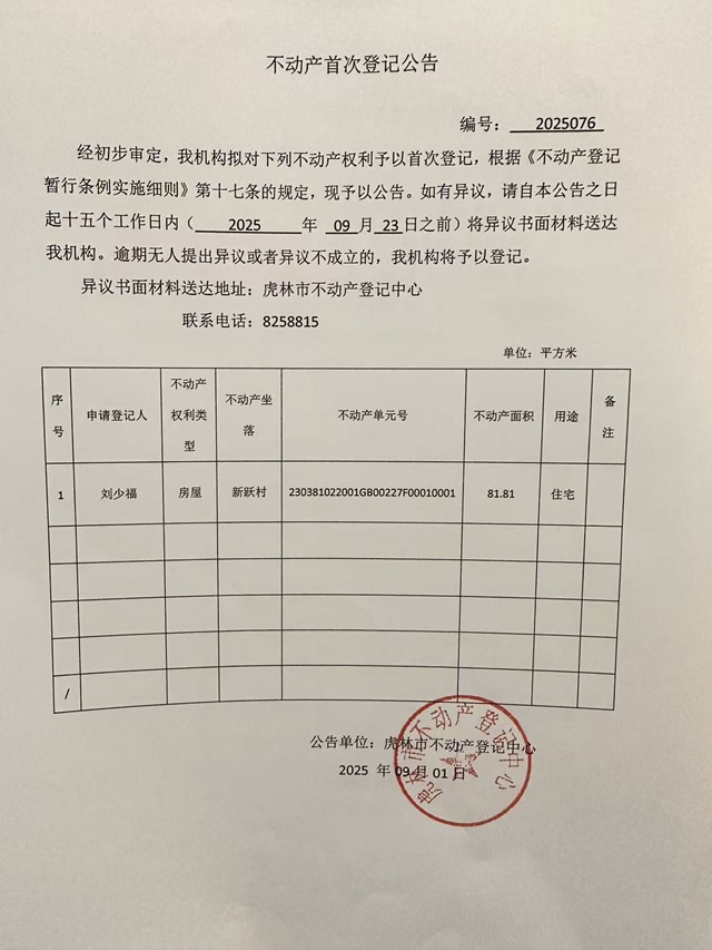 不动产首次登记公告-刘少福