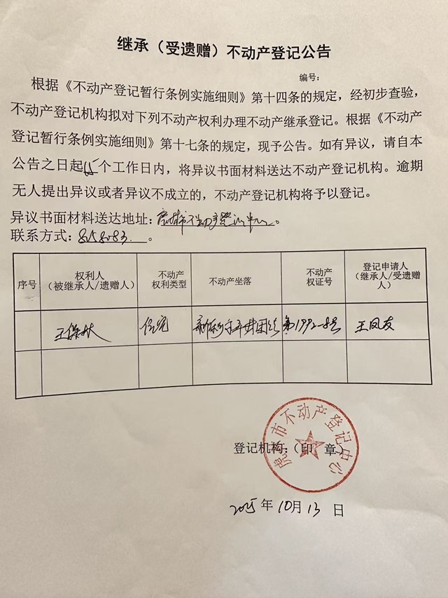 继承不动产登记公告-王凤友