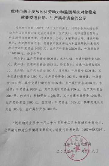 虎林市关于发放脱贫劳动力和监测帮扶对象稳定就业交通补助、生产奖补资金的公示