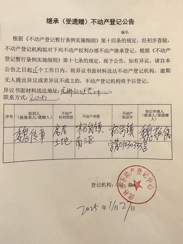 继承不动产登记公告-魏敬伟