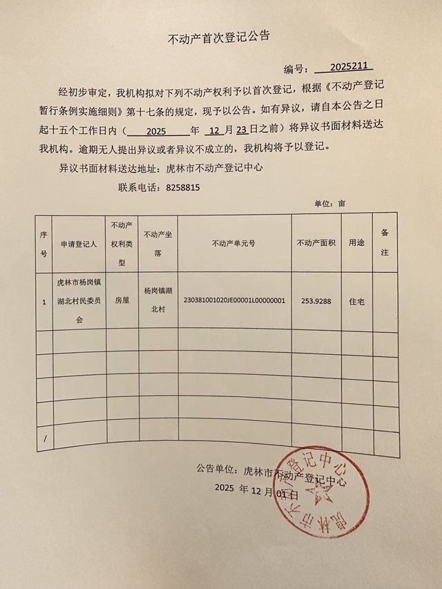 不动产首次登记公告-杨岗镇湖北村民委员会