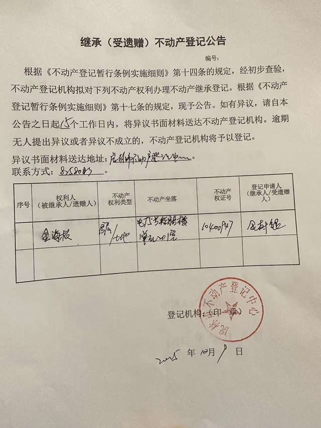 继承不动产登记公告-金树银