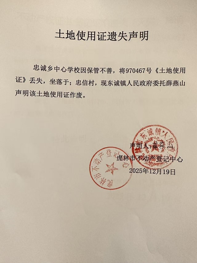 土地使用证遗失声明-忠诚乡学校