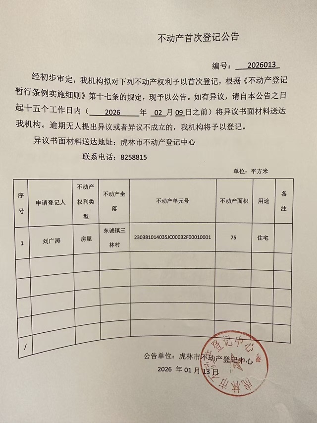 不动产首次登记公告-刘广涛