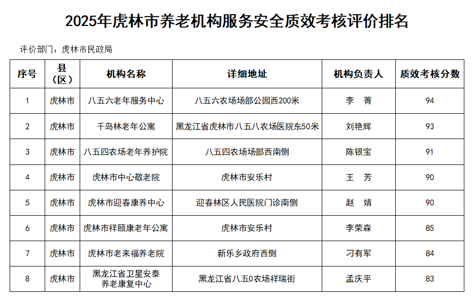 根据市民政局《鸡西市养老机构服务安全质效考核评价办法(试行)》要求,为进一步加强辖区养老机构服务安全监管,提升养老服务质量,我区已完成2025年下半年养老机构服务安全质效考核评分工作。现将本次评分结果及排名情况公布如下,接受社会监督。
