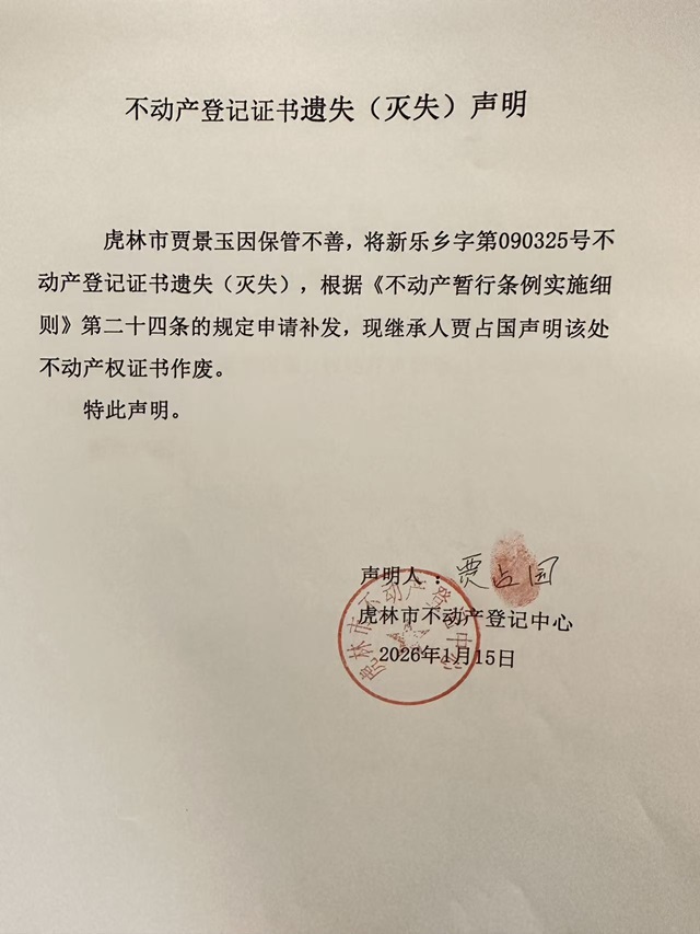 不动产权证书遗失声明-贾占国