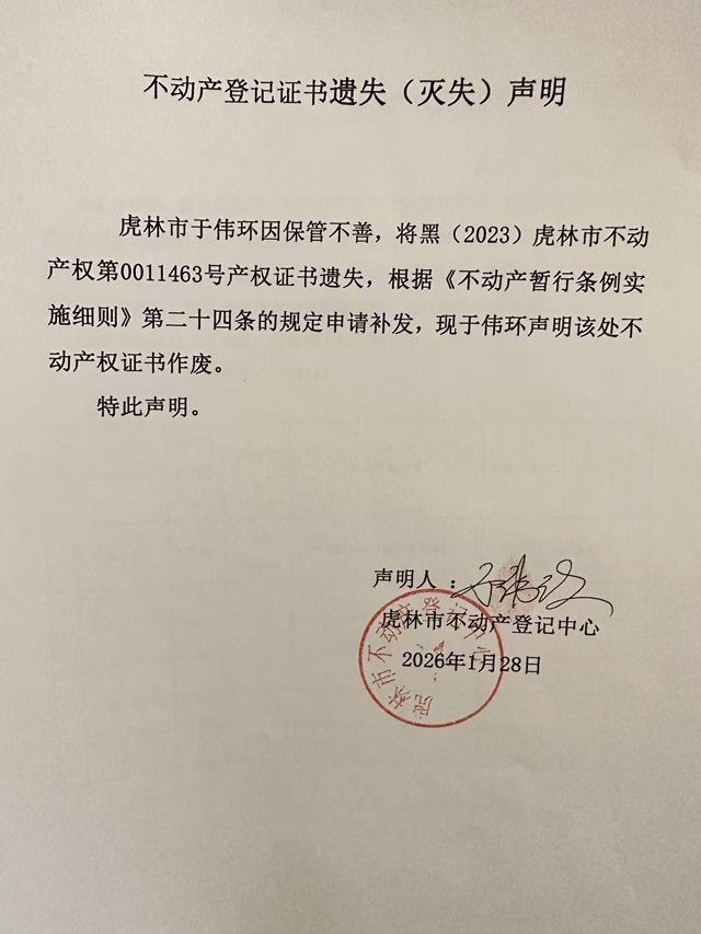 不动产权证书遗失声明-于伟环