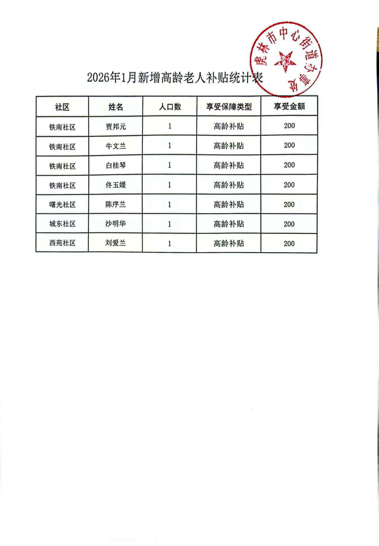 2026年1月新增高龄老人补贴统计表