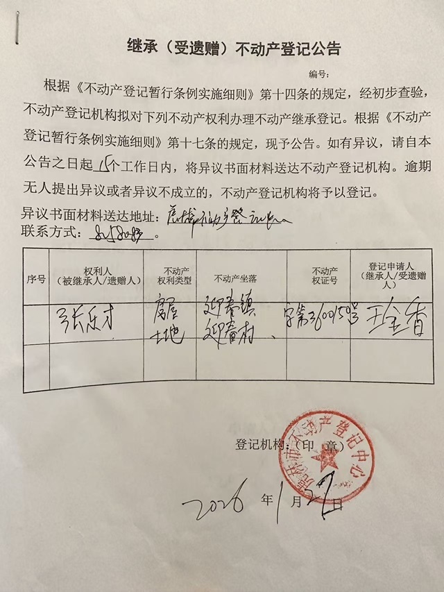继承不动产登记公告-王金香