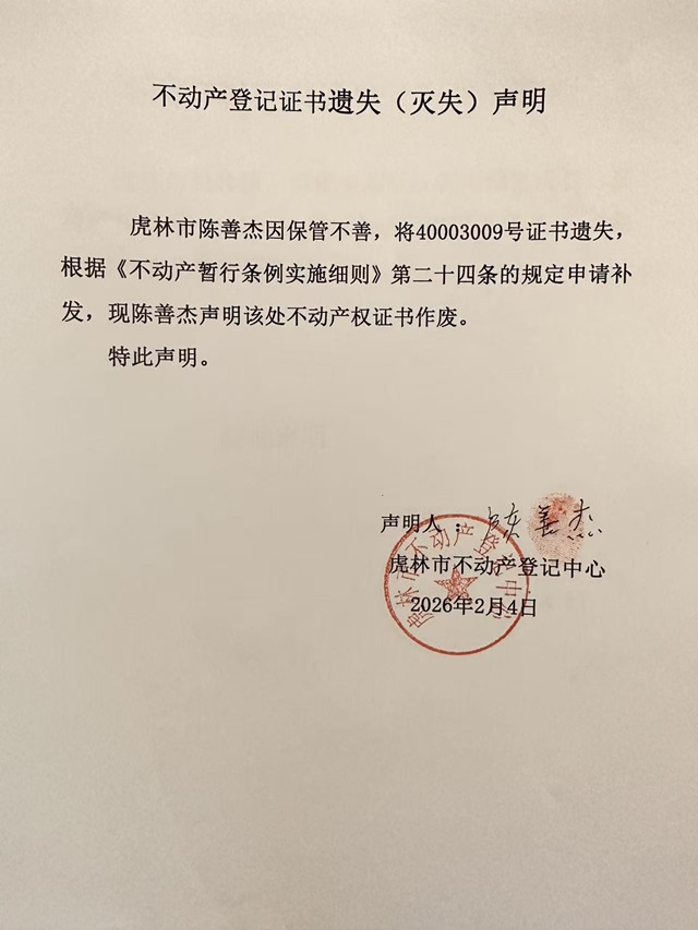 不动产权证书遗失声明-陈善杰