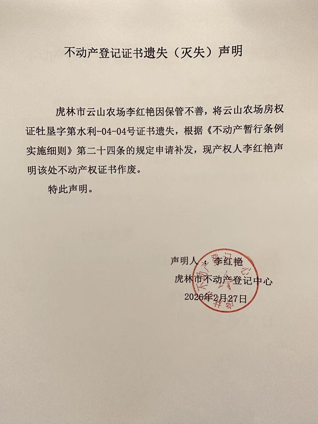 不动产权证书遗失声明-李红艳
