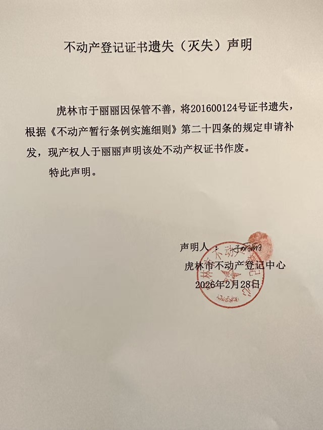 不动产权证书遗失声明-于丽丽