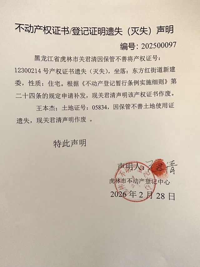 不动产权证书遗失声明-关君清