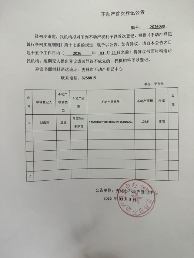 不动产首次登记公告-刘庆河