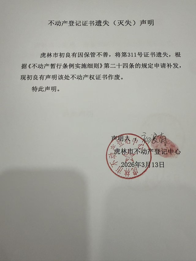 不动产登记证书遗失声明-初良友
