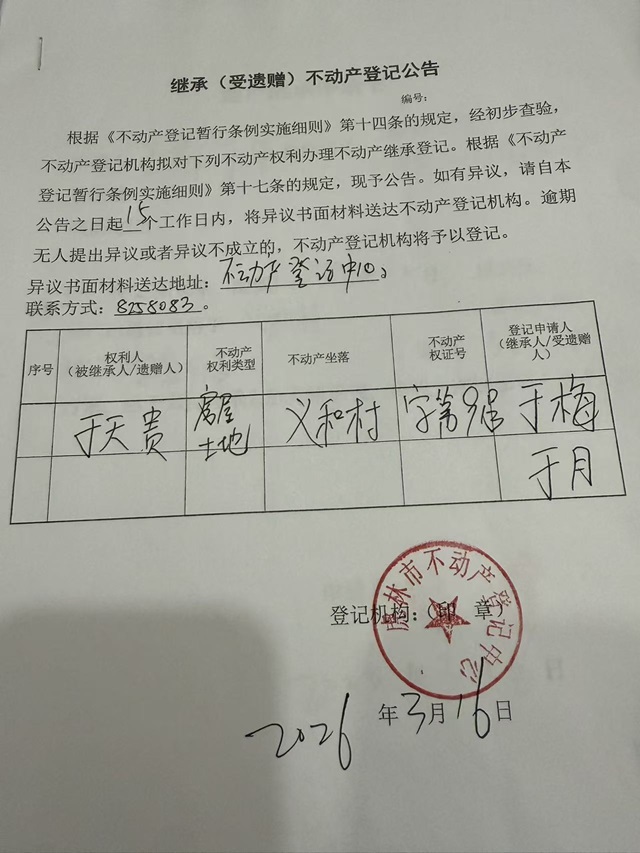 继承不动产登记公告-于梅 于月