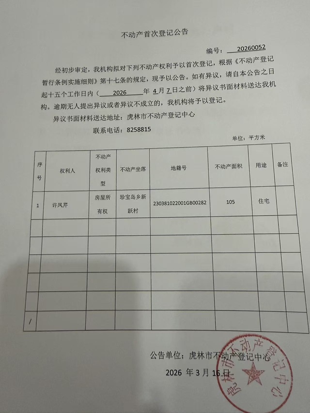 不动产首次登记公告-徐凤芹