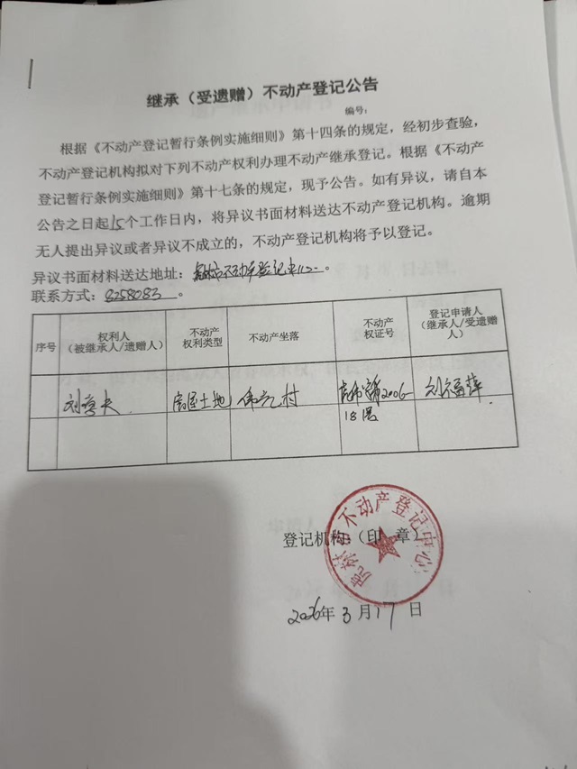继承不动产登记公告-刘福萍