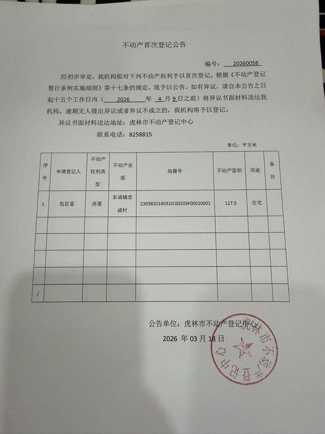 不动产首次登记公告-包臣富