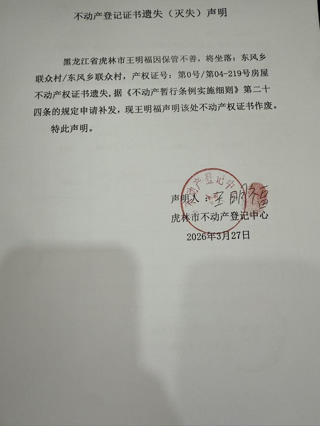 不动产登记证书遗失声明-王明福