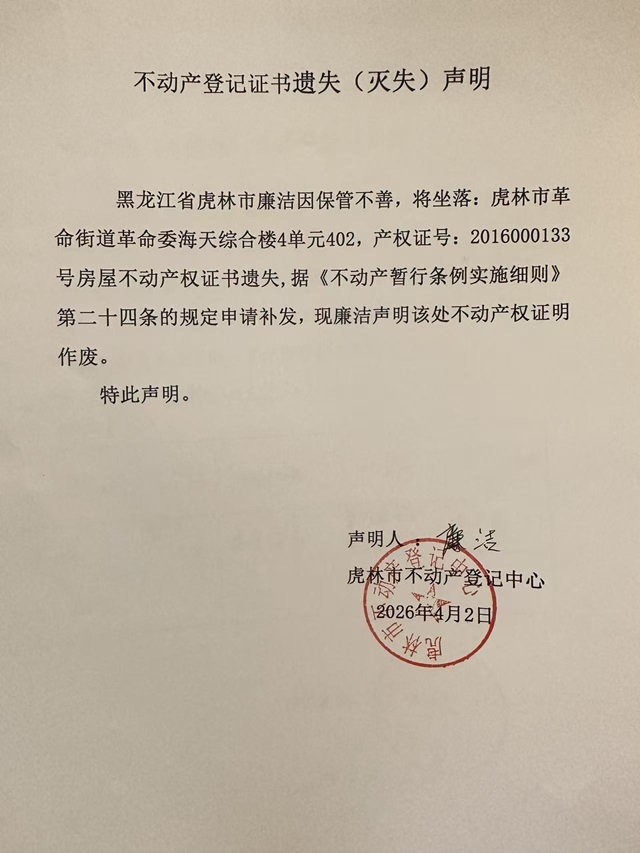 不动产权证书遗失声明-廉洁