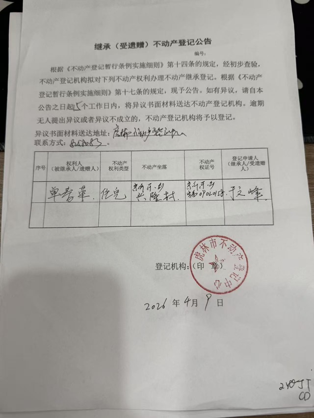 继承不动产登记公告-于文峰