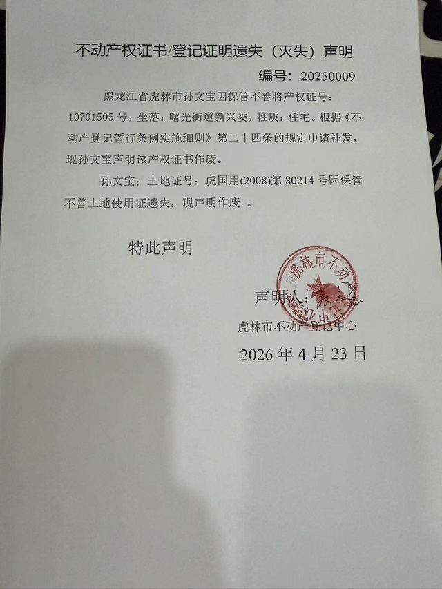 不动产权证书/登记证明遗失声明-孙文宝