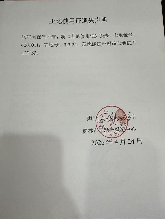 土地使用证遗失声明-姚淑红