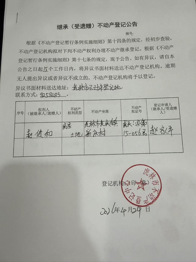 继承不动产登记公告-赵家平