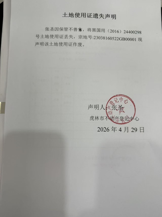 土地使用证遗失声明-张圣