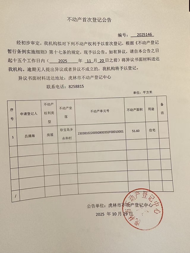 不动产首次登记公告-吕清海