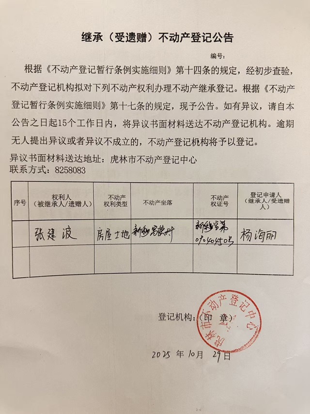 继承不动产登记公告-杨海丽