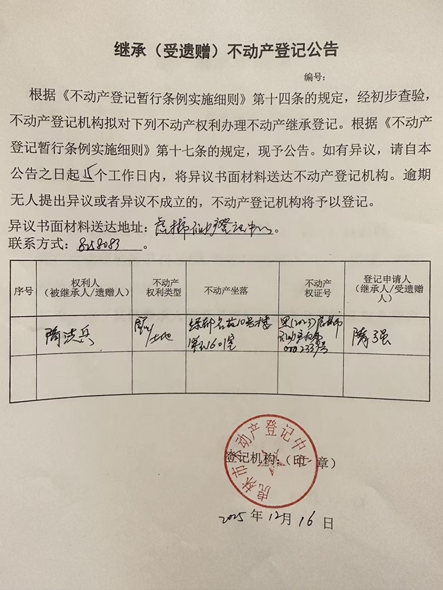 继承不动产登记公告-隋强