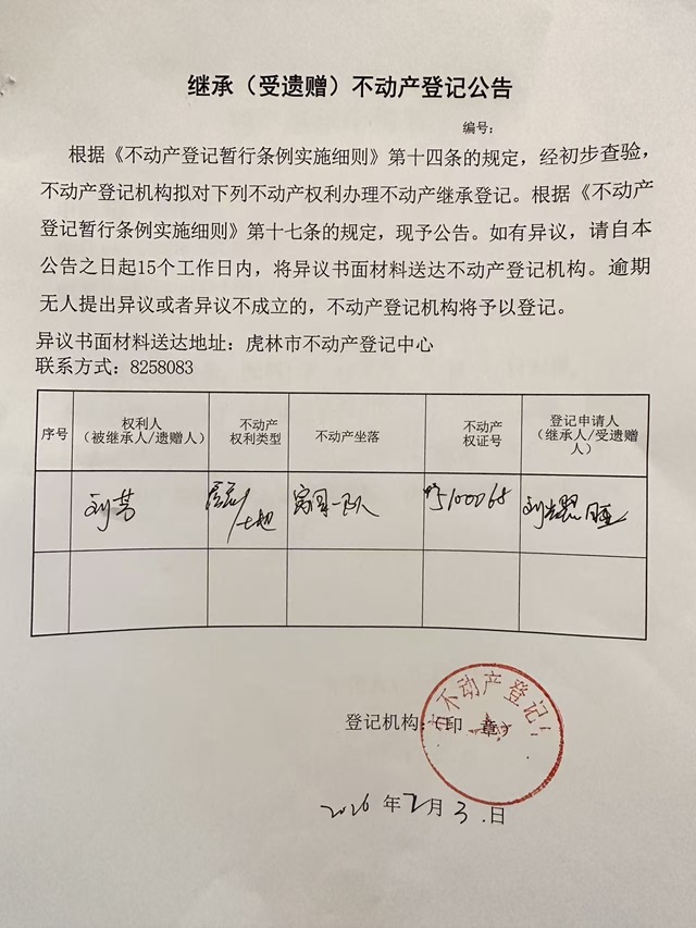 继承不动产登记公告-刘耀旺
