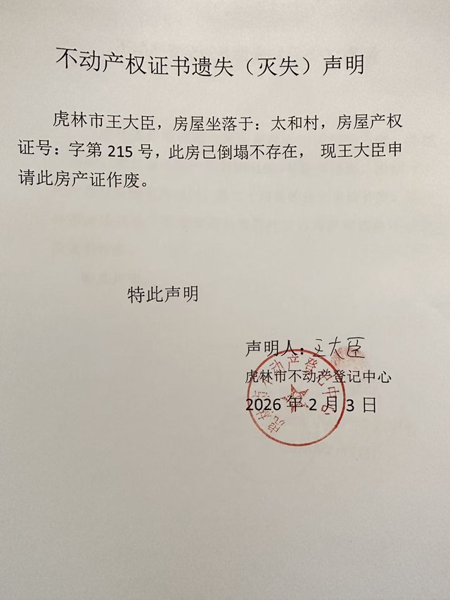 不动产权证书遗失声明-王大臣