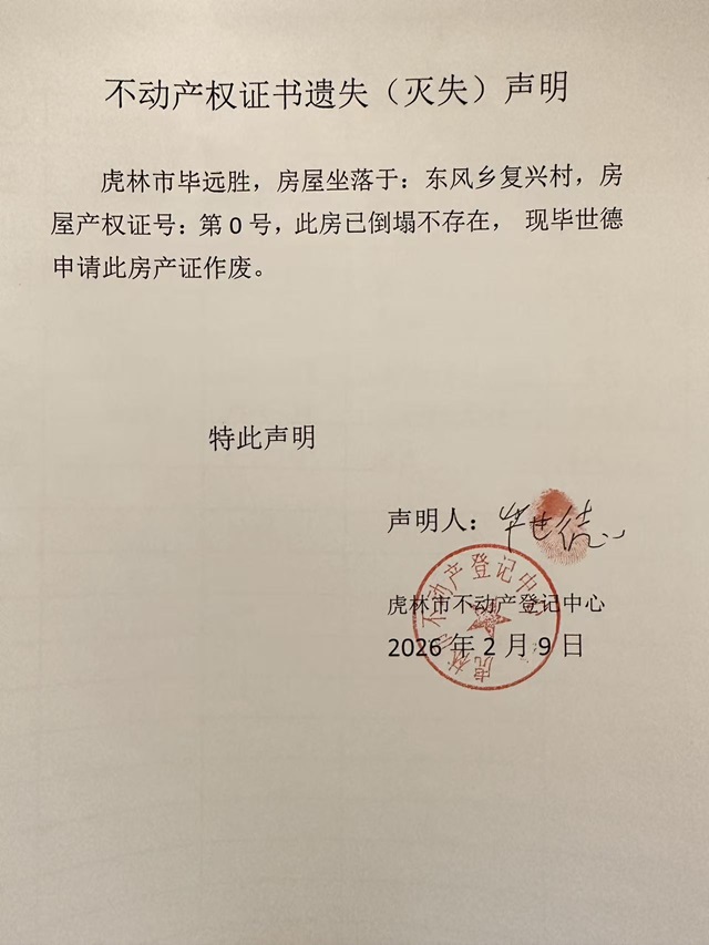 不动产权证书遗失声明-毕世德