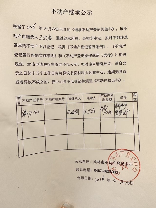 不动产继承公示-王大治
