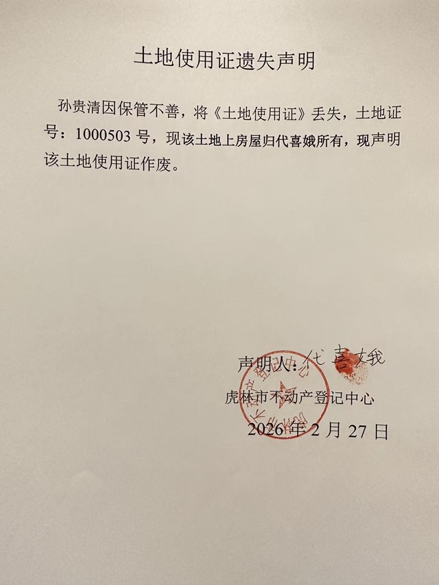 土地使用证遗失声明-代喜娥