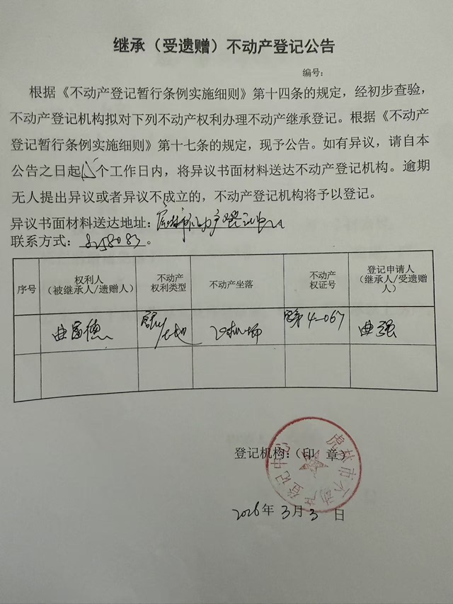 继承(受遗赠)不动产登记公告-曲强