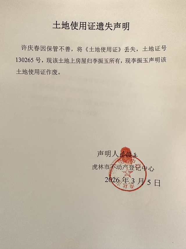 土地使用证遗失声明-李振玉