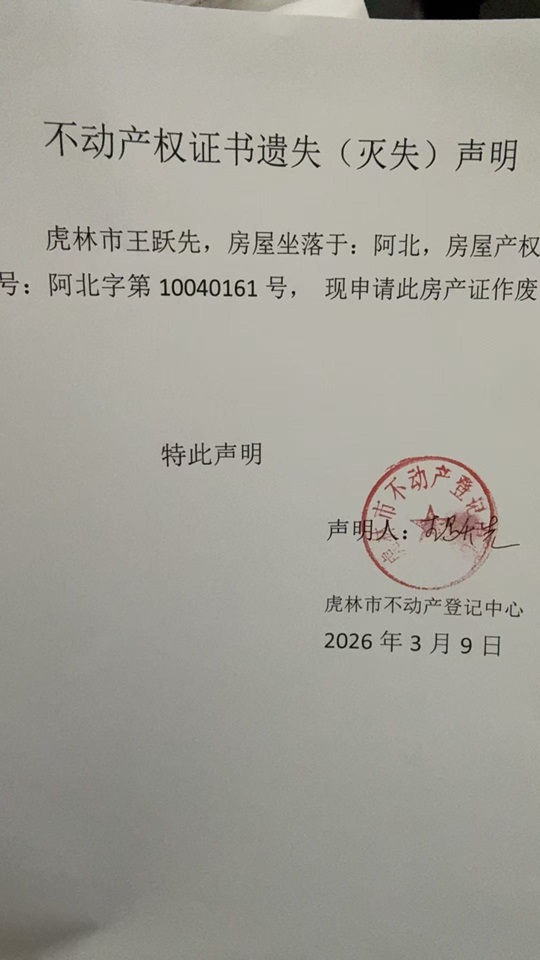 不动产权证书遗失声明-王跃先